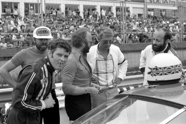 Alles hört auf mein Kommando - Loos mit seinem Adlatus Rüdiger "Meck" Hagen, ADAC-Funktionär Georg Schleich sowie den Leih-Piloten Henri Pescarolo und Brain Redman, der zum Rennen stets seinen mobielen Stiftzahn entfernt.