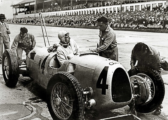 Auto Union Typ C (1936) - Boxenstopp mit Reifenwechsel an Rosemeyers Wagen beim Großen Preis von Deutschland am 26. Juli 1936 - hinten Ferdinand Porsche mit zwei Stoppuhren