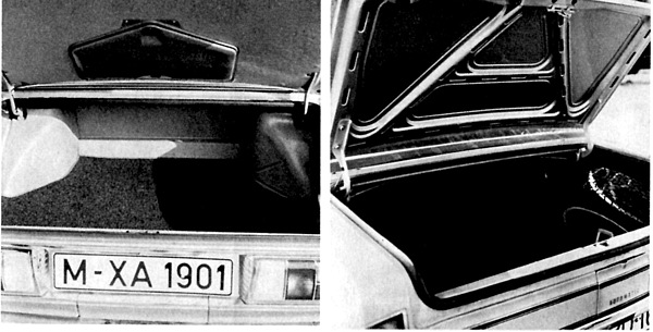 BMW 2800 gegen Opel Diplomat E von 1970 - hohe Nutzlast von 470 kg beim BMW, etwas knapp geratener Kofferraum mit praktisch angeordnetem Reserverad beim Opel