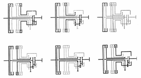 Borgward Isabella Hansamatic (1960) – Kraftfluss in den Schaltstufen 1, 2 und Neutral (oben) sowie 3, 4 und Rückwärts (unten)