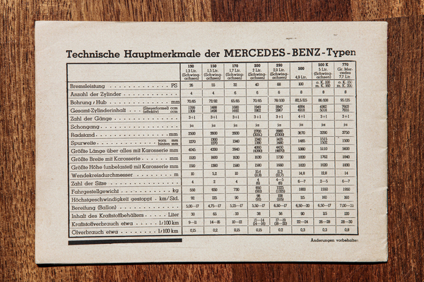 Datentabelle aller Modelle aus dem Mercedes-Benz-Prospekt 1935