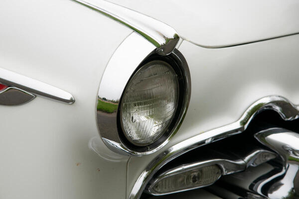 De Soto Fireflite Convertible (1955) – das Kotflügel-Ornamet verschmilzt mit der Scheinwerfereinfassung. Die De Sotos galten als die Chrysler-Modelle mit dem meisten "Bling"