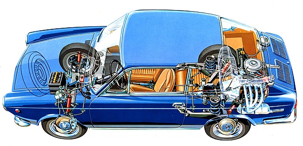 Fiat 850 Coupé (1967) - Grundkonstruktion und Technikkomponenten - Abbildung aus Faltprospekt