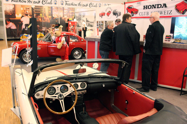 Honda S 600 Cabriolet (1966) - Blick über das Cockpit auf den Honda-Stand - Oldtimer- und Teilemarkt Fribourg 2014