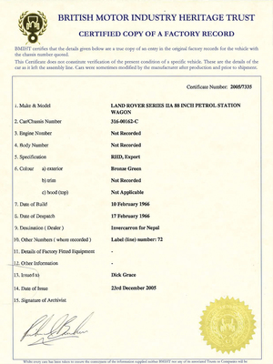 Land Rover Series IIA 88 (1966) - Zertifikat vom British Motor Heritage Trust