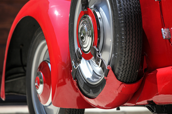 Mercedes-Benz 150 Sportroadster (1935) – "gegenläufige" Kotflügel an Hinterrad und Ersatzrad