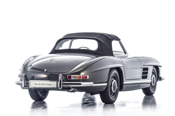 Mercedes-Benz 300 SL Roadster (W 198) (1957) – Handelsfahrzeug von Mercedes- Benz Classic. Exterieuraufnahme von rechts hinten mit geschlossenem Verdeck
