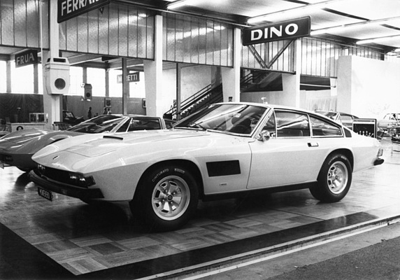 Monteverdi Berlinetta am Genfer Automobilsalon 1972 - Premiere eines neuen Coupés mit hoher Motorleistung, erhöhter Sicherheit und neu gestaltetem Gesicht dahinter gut zu sehen der Monteverdi Hai