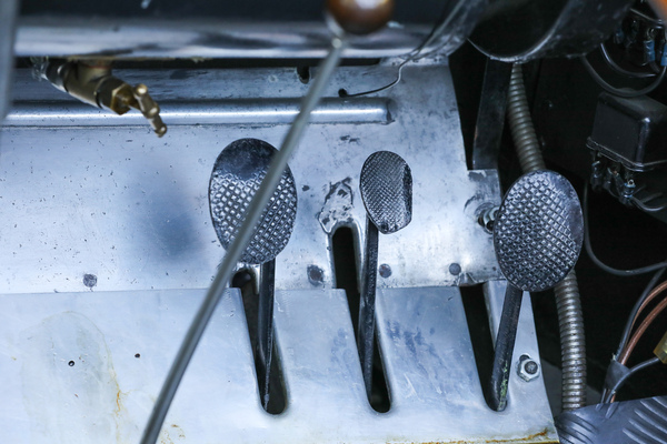 Opel 4 PS "Laubfrosch" (1924) – Das Gaspedal sitzt in der Mitte. Links im Bild der nie ganz dichte "Dreiwegehahn" für die Benzinzufuhr