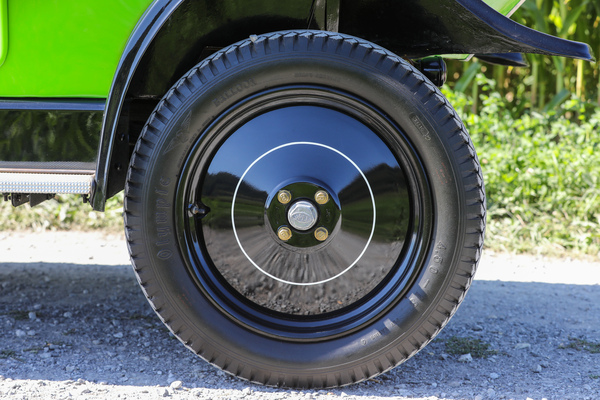 Opel 4 PS "Laubfrosch" (1924) – Modern: Stahlscheibenräder statt Holzspeichen, Opel-Zeichen auf der Radnabe