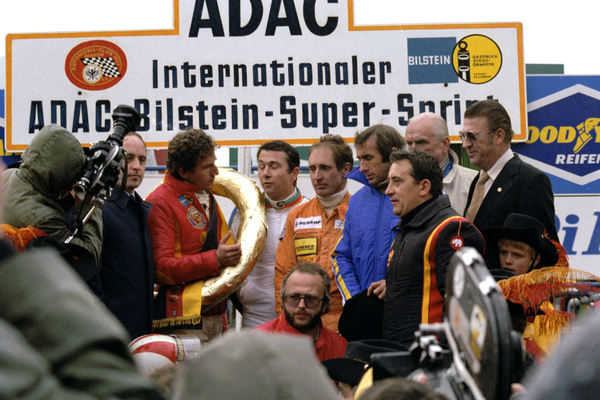 Triumph am Ring - Loos-Pilot Stommelen schlägt Kremer-Mann Wollek im DRM-Finale 1977. Manfred Schurti und Ehrengast Jackie Stewart komplettieren das Podium.