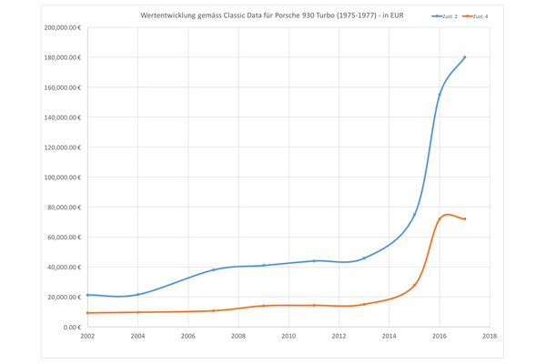 Wertentwicklung des Porsche 911 Turbo 3-Liters (930, 1974-1977) seit 2002 (Stand Ende 2016)