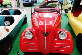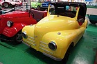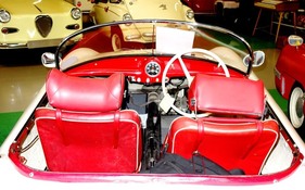 Ein Dach über dem Kopf bot der als führerscheinfreier Stadtwagen offerierte Meister K 5 aus Österreich, der allerdings ausnahmsweise schon aus den 1970er Jahren stammt. In perfektem Zustand präsentiert sich der rot/weiß lackierte Champion CH-2 von 1949. Er stammt aus dem Bestand von Bruce Weiner, dessen Sammlung von "Microcars" 2013 unter großer medialer Beachtung versteigert wurde. Damals erzielte ein FMR Tg 500 "Tiger" einen Rekordpreis. Fast überflüssig zu erwähnen, dass sich auch ein Exemplar dieses legendären vierrädrigen Kabinenrollers auch in der Sammlung Voit findet. Eigentlich sind es sogar zwei, denn eine aus Eisenteilen zusammengeschweißte Skulptur des "Tigers" im Maßstab 1:1 befindet sich direkt daneben.