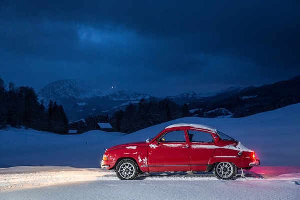 Hochbeinig, kugelförmig und wintertauglich – das muss kein VW Käfer sein. Der Saab 96 macht mit Frontmotor, Vorderradantrieb und Wasserkühlung so ziemlich alles anders als der VW, ist aber für den Skiurlaub ebenso gut geeignet wie für die Rallye Monte Carlo. Für diesen Artikel wagten wir uns mit einem Saab 96 von 1975 in die verschneiten Berge und zeigen den roten Farbklecks im weissen Winterwunderland auf vielen Fotos.