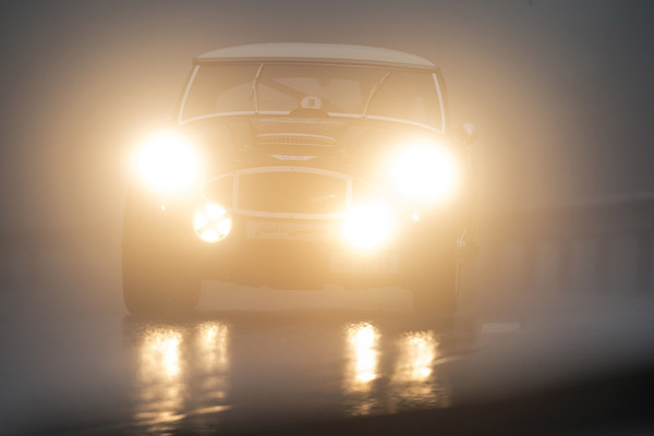 Es gab nun genug Zeit für eine Kaffeepause, sich aufzuwärmen und vor allem der Nässe zu entfliehen. Mittlerweile kam dichter Nebel auf und hüllte die Strecke sogar in den Waldstücken in ein undurchsichtiges Weiss. Die Streckenposten waren völlig machtlos, eventuelle Überholmanöver rechtzeitig zu erkennen und konnten nur nach Gehör die Flaggen zeigen. Als Fotograf bekam man ein ähnliches Problem und kämpfte mit fast unlösbaren Sichtverhältnissen. Nach wenigen Autos der ersten Gruppe ein weiterer Funkspruch: "Rooot, der hat die ganze Schikane abgeräumt….aber Fahrer ok!"