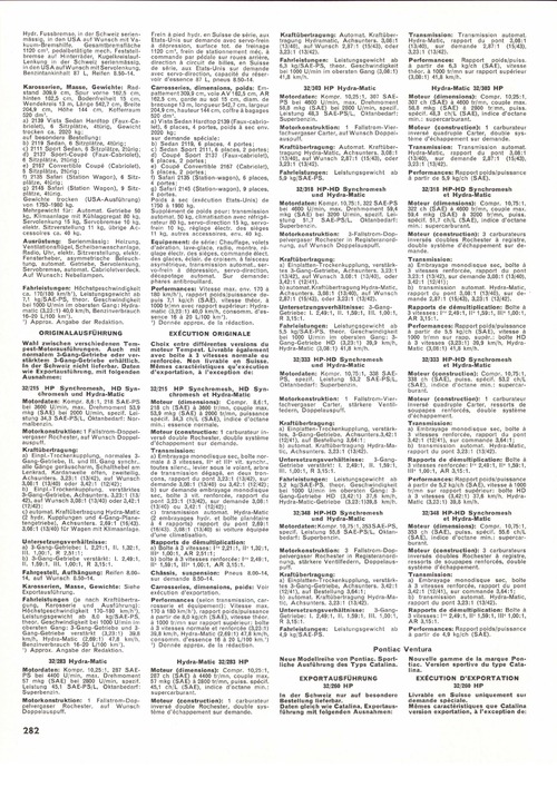 Neue Modellreihe von Pontiac. Sportliche Ausführung des Typs Catalina. Exportausführung in der Schweiz nur auf besondere Bestellung lieferbar. Daten gleich wie Catalina, Exportausführung mit folgenden Ausnahmen: