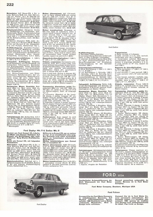 Compact Car der Ford Motor Company in selbsttragender Bauweise. Auf Wunsch leistungsfähigerer Sechszylinder. 1962: Erweiterte und im Detail verbesserte Modellreihe. Wird in Europa nicht vertrieben.