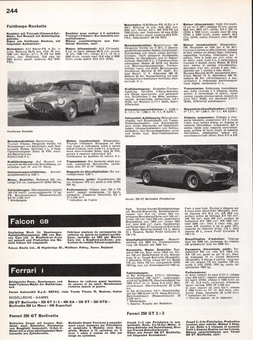 Coupé 2+2 von Pininfarina in auslaufender Serie. 3-L-12-Zyl.-Motor, 4- Gang-Getriebe mit Schnellgang, Dunlop-Vierrad-Scheibenbremse. Daten wie Ferrari 250 GT Berlinetta, mit folgenden Ausnahmen: