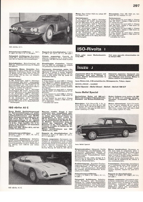 Neues Modell. Hochleistungscoupe für Sportveranstaltungen, mit selbsttragender, im Unterbau mit stahlverstärkter Leichtmetallkarosserie und 350-PS- Motor. Karosserieentwurf Bertone, gebaut durch Sport Cars in Modena. Fahrzeugherstellung in der eigenen Werkstätte des ISO-Ingenieurs Bizzarrini & Co., VialeIppolito, 114, in Livorno. In der Schweiz auf besondere Bestellung lieferbar. Daten wie ISO «Grifo» A3 L, mit folgenden Ausnahmen: