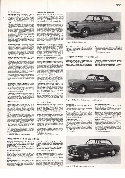 Cabriolet nach den Entwürfen von Pininfarina. Vergaseroder Einspritzmotor. Debüt Paris 1961. Daten wie Peugeot 404 Berline Grand Tourisme, mit folgenden Ausnahmen: