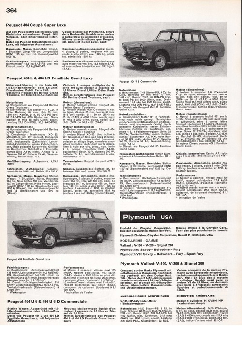 Mehrzweckfahrzeug in der Serie 404, 1,6-Liter-Benzinmotor oder 1,8-Liter- Dieselmotor. Debüt Paris 1962. Daten wie Peugeot 404 Berline Grand Tourisme, mit folgenden Ausnahmen: