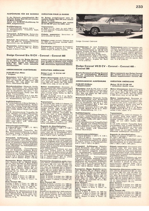 Intermediate car der Dodge Division (in der Schweiz nicht lieferbar) mit 6-Zyl.-Motor. Ersetzt den bisherigen Dodge Six. 1965: leicht reduzierte Abmessungen