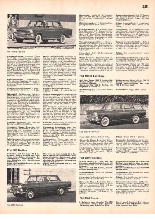 Geräumige, auf dem Typ 1800 B basierende, jedoch stärkere und luxuriöser ausgerüstete Limousine. Getriebeautomat, Schnellgang, automat. Kupplung oder Servolenkung auf Wunsch. Daten wie Fiat 1800 B Berlina, mit folgenden Ausnahmen: