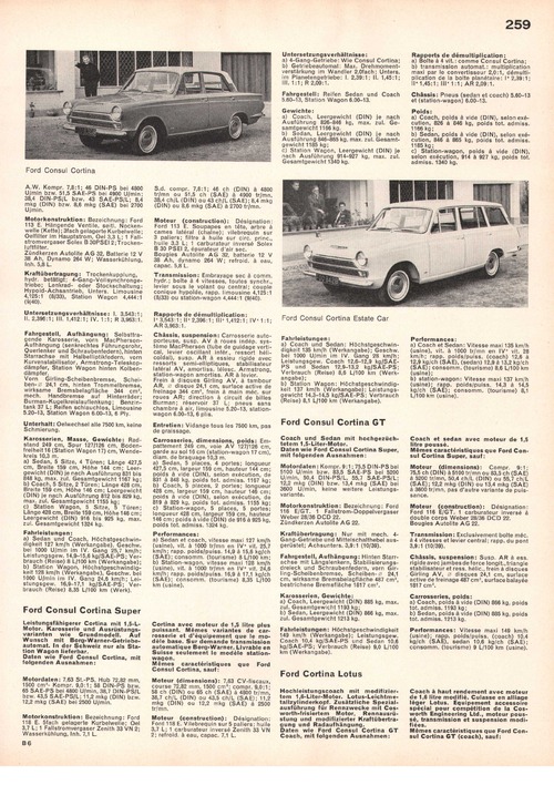 Hochleistungscoach mit modifiziertem 1,6- Lit er-Motor. Lotus-Leichtmetallzylinderkopf. Zusätzliche Spezialausführung für Rennzwecke mit Cosworthfrisiertem Motor, Rennausrüstung und modifizierter Kraftübertragung und Radaufhängung. Daten wie Ford Consul Cortina GT Coach, mit folgenden Ausnahmen: