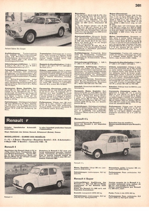 Nachfolger des Renault Heck 4 CV in völlig neuer Form. Frontantrieb, Station-Wagon-Karosserie. 747-cm3-Motor für den französischen Markt und 845-cm3-Motor für die übrigen Länder. Debüt Frankfurt 1961.