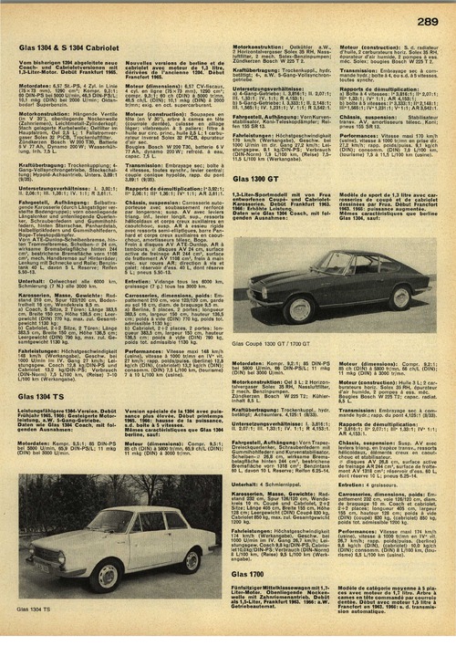1,3-Liter-Sportmodell mit von Frua entworfenen Coupé- und Cabriolet- Karosserien. Debüt Frankfurt 1963. 1966: Erhöhte Leistung. Daten wie Glas 1304 Coach, mit folgenden Ausnahmen: