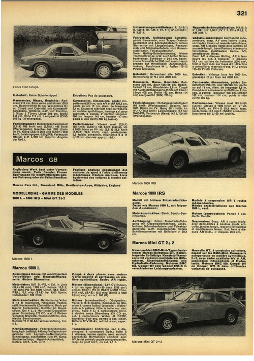 Neuer, auf den BMC-Mini-Typen basierender Marcos-Selbstbau-GT. Selbsttragende 2+2sitzige Kunststoffkarosserie mit vorderem und hinterem Hilfsrahmen, Einzelradaufhängung und Hydrolastic-Federung. Motoren BMC 850, Cooper 997 oder Cooper 1275 S in verschiedenen Leistungsvarianten.