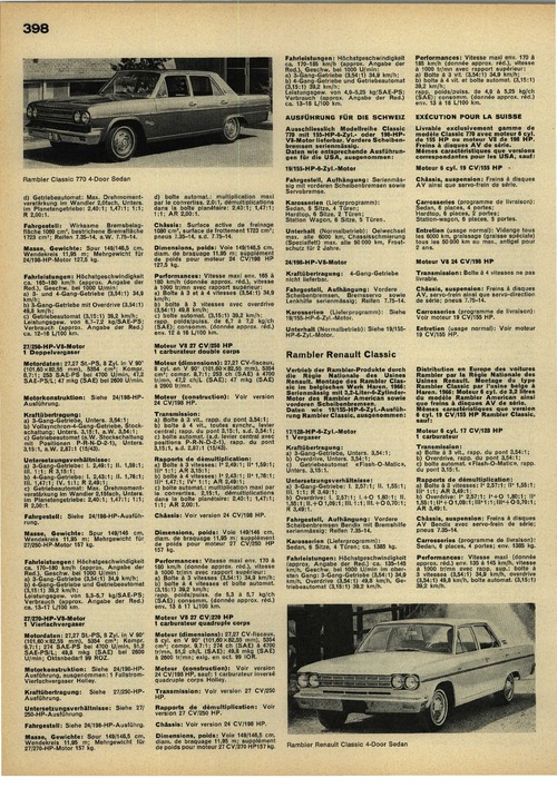 Rambler Renault ClassicVertrieb der Rambler-Produkte durch die Régie Nationale des Usines Renault. Montage des Rambler Classic im belgischen Werk Hären. 1966: Serienmässig mit 3,2-Liter-6-Zylinder- Motor des Rambler American sowie vorderen Scheibenbremsen. Daten wie 19/155-HP-6-Zyl.-Ausführung Rambler Classic, ausgenommen: