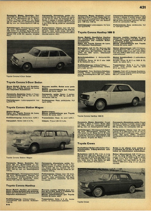 Neues Modell. Hardtop mit 1,5-Liter- Motor, 3-Gang-Getriebe oder Automat. Daten wie Toyota Corona de Luxe, mit folgenden Ausnahmen: