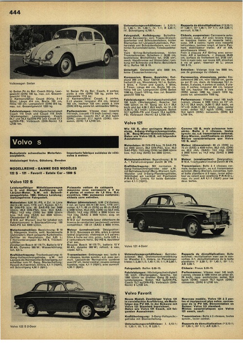Wie 122 S, aber geringere Motorleistung. 4-Gang-Vollsynchrongetriebe, a.W. Borg-Warner-Getriebeautomat. Daten wie Volvo 122 S, mit folgenden Ausnahmen: