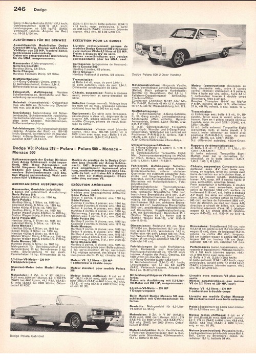 Spitzenerzeugnis der Dodge Division (von Amag Schinznach nicht importiert). 1967: Neue Karosserien mit leicht längerem Radstand, Hardtop- Modelle mit neuer Dachlinie, a.W. vordere Scheibenbremsen (bei Station Wagon serienmässig). Wahl zwischen fünf V8-Motoren