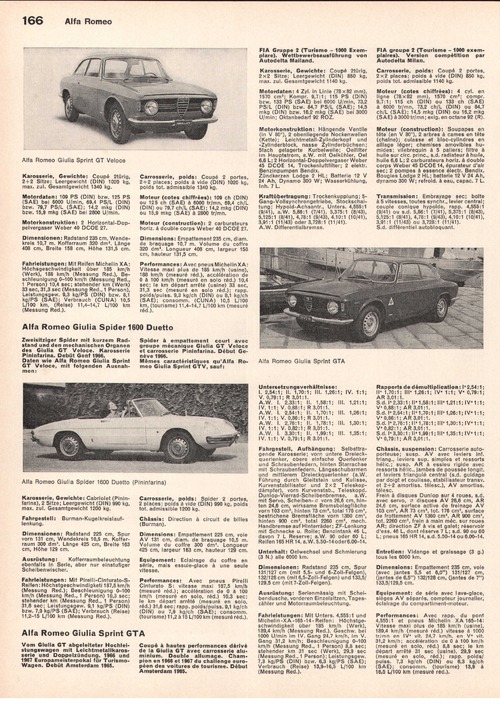 Zweisitziger Spider mit kurzem Radstand und den mechanischen Organen des Giulia GT Veloce. Karosserie Pininfarina. Debüt Genf 1966. Daten ähnlich wie Alfa Romeo Giulia Sprint GT Veloce