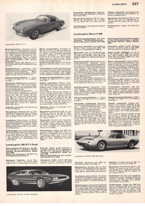Neuer, 4sitziger GT-Wagen; vom Modell 400 GT 2+2 abgeleitet. Selbsttragende Bertone-Karosserie. Debüt Genf 1968.Daten wie Lamborghini 400 GT 2+2, mir folgenden Ausnahmen:
