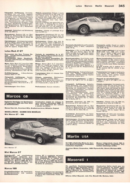 Selbstbau-GT, auf verschiedenen BMC-Mini-Typen basierend. 2+2- sitzige, selbsttragende Kunststoffkarosserie mit vorderem und hinterem Hilfsrahmen. Motoren BMC 850, Cooper 997 oder Cooper S 1275 in verschiedenen Leistungsvarianten.Marcos 1600Kunststoffzweisitzer mit Ford-1,6-Liter-Querstrommotor und vorderen Scheibenbremsen.