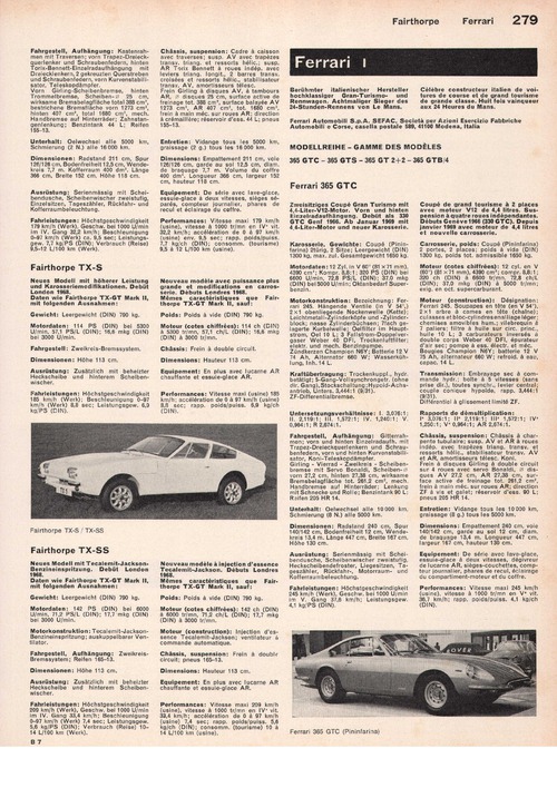 Zweisitziges Coupé Gran Turismo mit 4,4-Liter-V12-Mctor. Vorn und hinten Einzelradaufhängung. Debüt als 330 GTC Genf 1966. Ab Januar 1969 mit 4 4-Liter-Motor und neuer Karosserie.