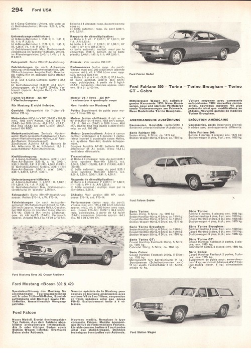 Mittelgrosser Wagen mit selbsttragender Karosserie. 1970: Neue Karosserien, neue und stärkere V8-Motoren sowie Verbesserungen am Fahrwerk. Neue Modellreihe Torino Brougham.