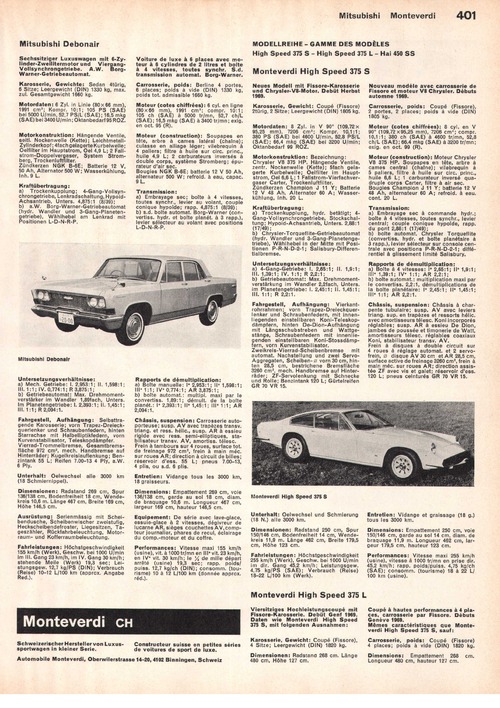 Viersitziges Hochleistungscoupé mit Fissore-Karosserie. Debüt Genf 1969. Daten wie Monteverdi High Speed 375 S, mit folgenden Ausnahmen:
