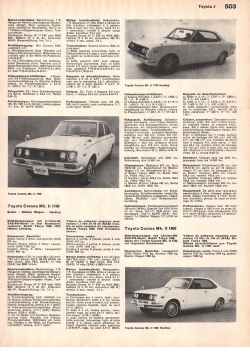 Mittelklassewagen mit 1,9-Liter-100- SAE-PS-Motor. Debüt Tokyo 1968. Daten wie Toyota Corona Mk. II 1700, mit folgenden Ausnahmen: