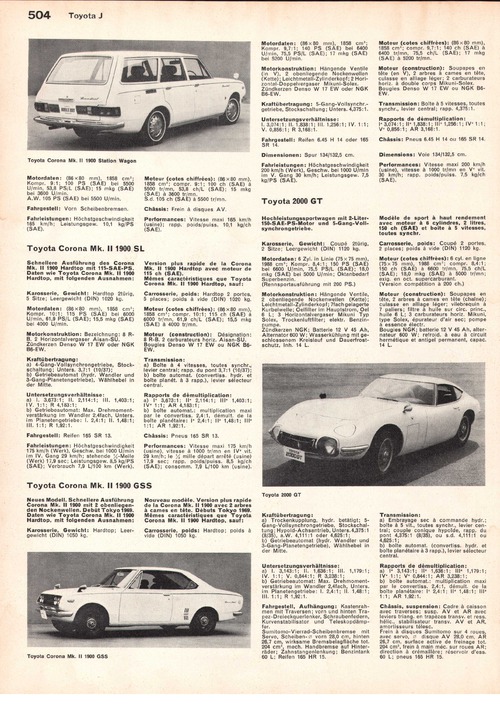 Neues Modell. Schnellere Ausführung Corona Mk. II 1900 mit 2 obenliegenden Nockenwellen. Debüt Tokyo 1969. Daten wie Toyota Corona Mk. II 1900 Hardtop, mit folgenden Ausnahmen: