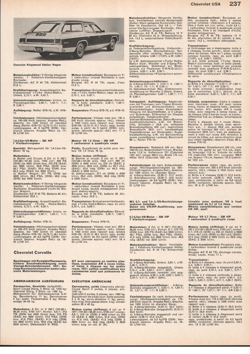 Chevrolet CorvetteSportwagen mit Kunststoffkarosserie, hinterer Einzelradaufhängung sowie Vierrad-Scheibenbremsen. 1971: Geringe Karosserieretouchen sowie reduzierte Motorleistungen.Mit 5,7- und 7,4- L-V8-Hochleistungsmotoren lieferbar.Daten wie 270-HP-Ausführung, ausgenommen:5,7-Liter-V8-Motor - 330 HP 1 Vierfachvergaser