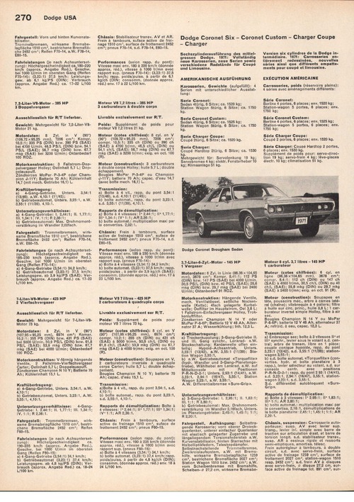 Dodge Coronet Six - Coron - ChargerSechszylinderausführung des rnîttelgrossen Dodge. 1971: Vollständig neue Karosserien, neue Serien sowie verschiedene Radstände für Coupé und Limousine.Dodge Coronet Brougham Sedan