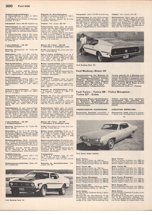 Ford Mustang «Boss» 351Spezialausführung des Mustang für amerikanische Tourenwagenrennen mit leistungsgesteigertem 5,8-Liter- V8-Motor, Spezialaufhängung und Bremsen (Scheiben vorn), direktere Lenkung sowie F60-15-Reifen. Achsunters. 3,50:1, a.W. 3,91:1, 4,11:1. Ausschliesslich 4-Gang-Getriebe.