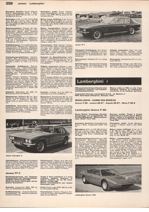 Jensen FF IIHochleistungscoupe mit Ferguson- Vierradantrieb und Chrysler-6,3-Liter- V8-Motor. Debüt London 1966. Daten wie Jensen Interceptor, mit folgenden Ausnahmen:
