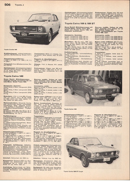 Toyota Carina 1600 & 1600 STNeues Modell. Mittelklassewagen mit 1,6-Liter-Motor. Debüt Tokio 1970. Daten wie Toyota Carina 1400, mit folgenden Ausnahmen: