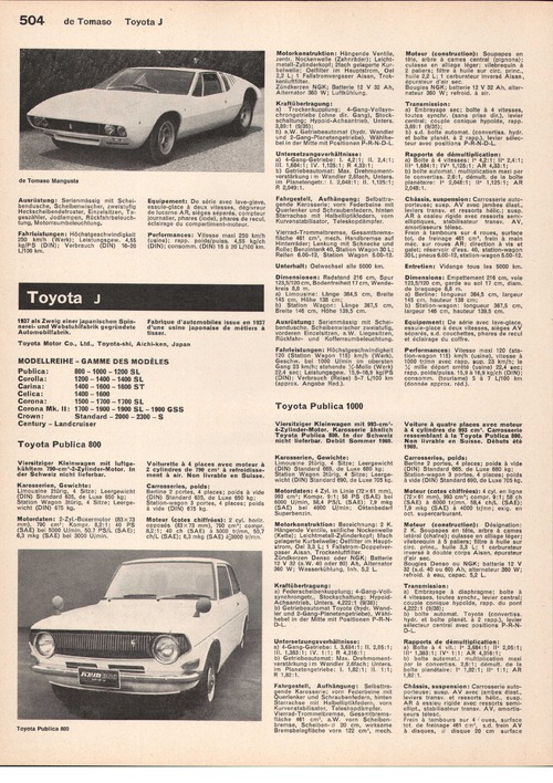 Toyota Publica 1000Viersitziger Kleinwagen mit 993-cm- 4-Zylinder-Motor. Karosserie ähnlich Toyota Publica 800. In der Schweiz nicht lieferbar. Debüt Sommer 1969.
