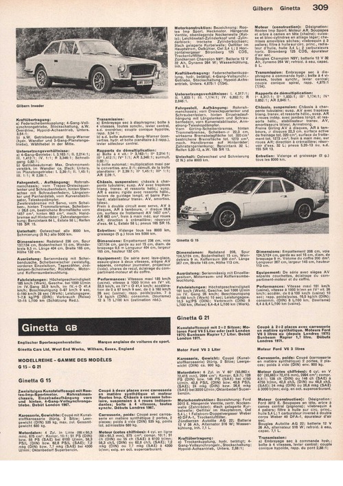 Zweisitziges Kunststoffcoupé mit Rootes-Imp-Sportmotor. Rohrrahmenchassis, Einzelradaufhängung vorn und hinten. 4-Gang-Vollsynchrongetriebe. Debüt London 1967.
